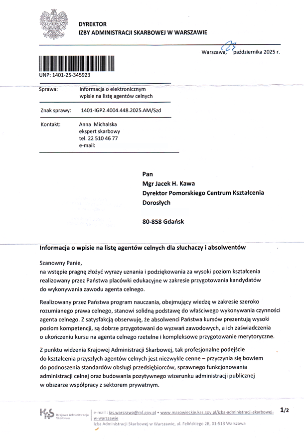 Osób posiadających wpis na listę Agentów celnych uzupełniających wiedzę merytoryczną w zakresie spraw celnych.
